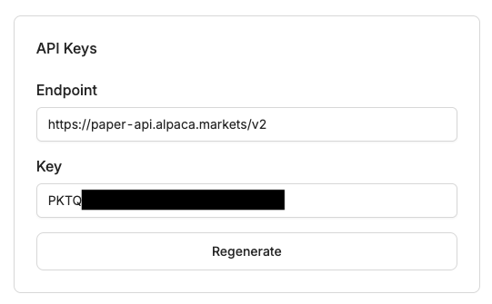 Edit your .env and add a Google API key which you can get from AI Studio, and one from Alpaca from the API Keys box on the account overview.